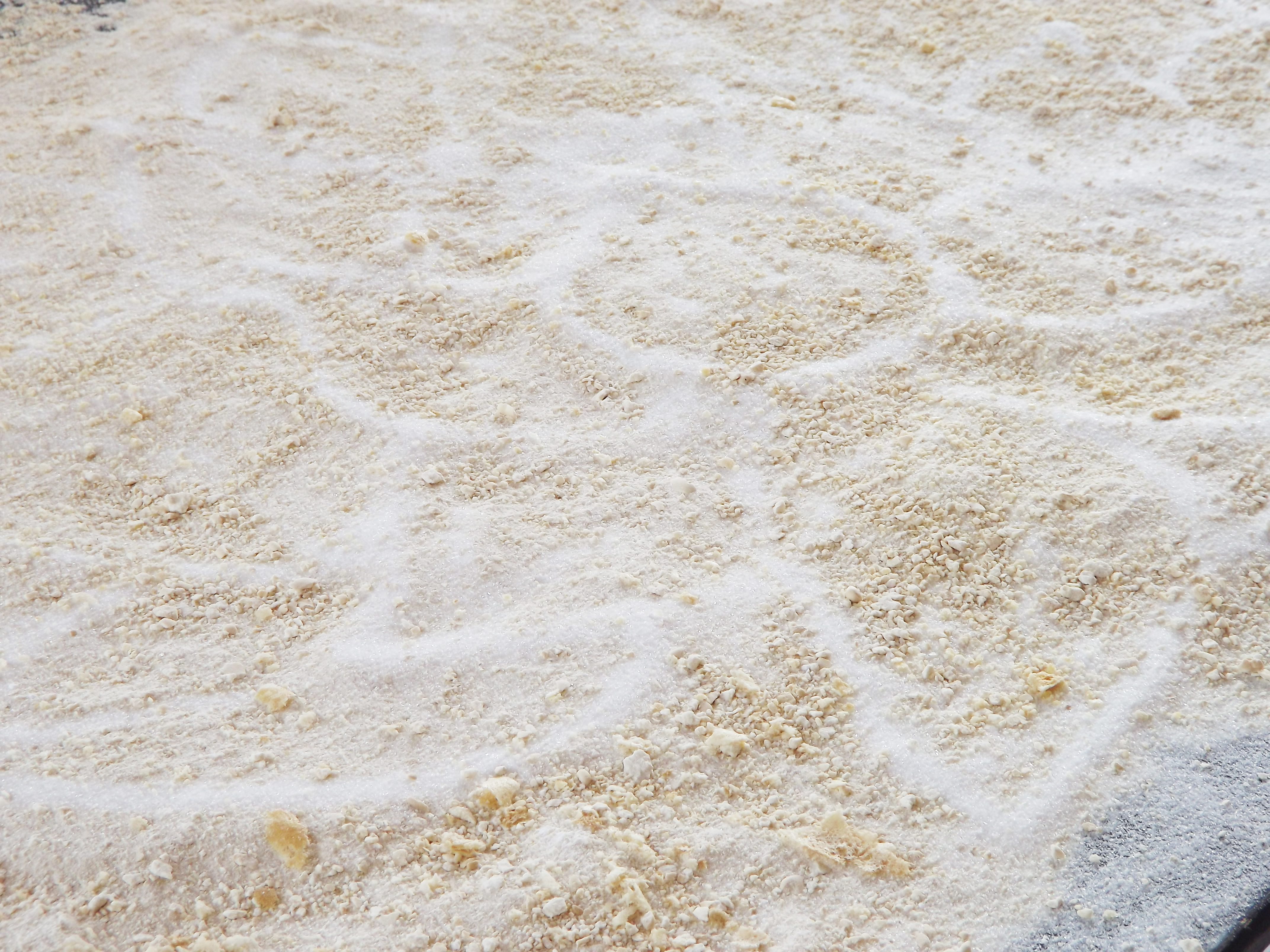 Crushed egg roll cookies, sugar, table, block printed joss paper, glass beads, 2019